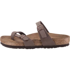 Birkenstock Damen Zehentrenner/ Pantoletten MAYARI Braun Synthetik – komfortable Fußbettung für ganztägigen Tragekomfort – verstellbare Schnallen zur optimalen Anpassung – Sohlenrahmen in Korkoptik
