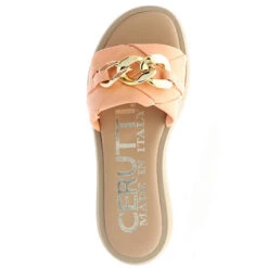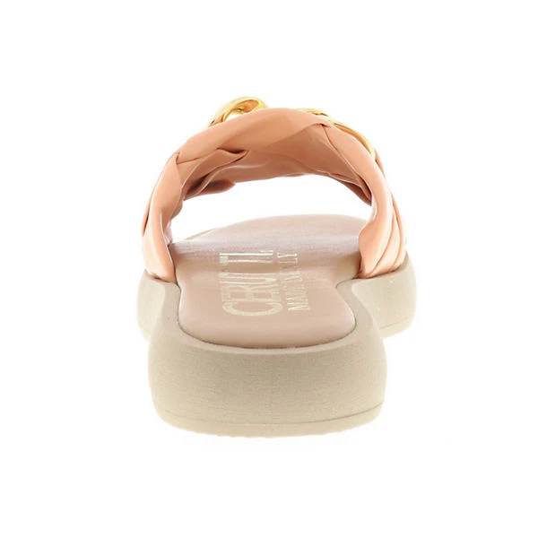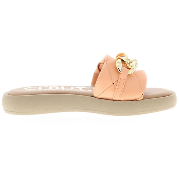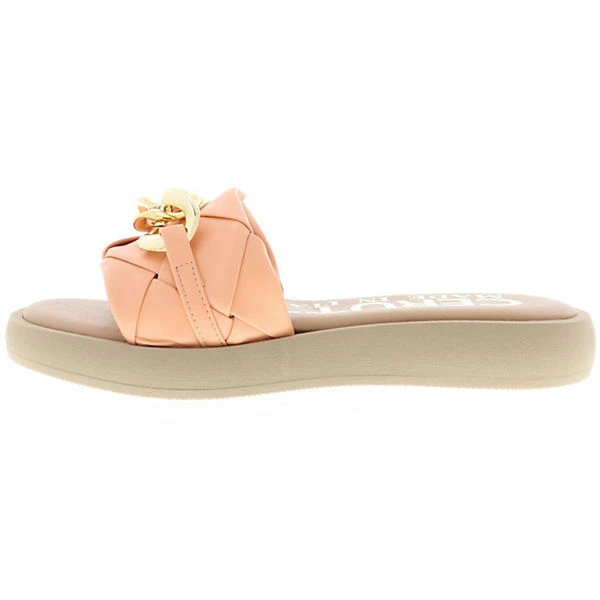 Eine schlichte und dennoch, durch den geflochtenen Riemen mit angebrachter, goldener Kette, auffallende Pantolette für den Sommer. Die profilierte Laufsohle und das durchgängige Plateau mit Keilabsatz sorgen für ein tolles Laufgefühl. Die gepolsterte Softdecksohle federt jeden Schritt angenehm weich ab.