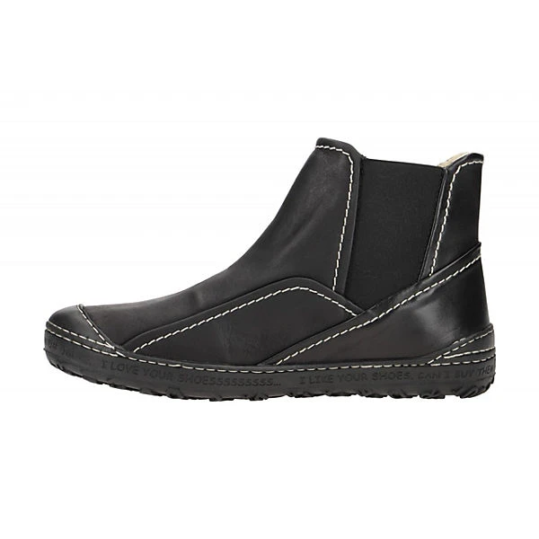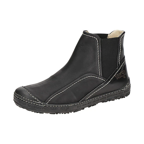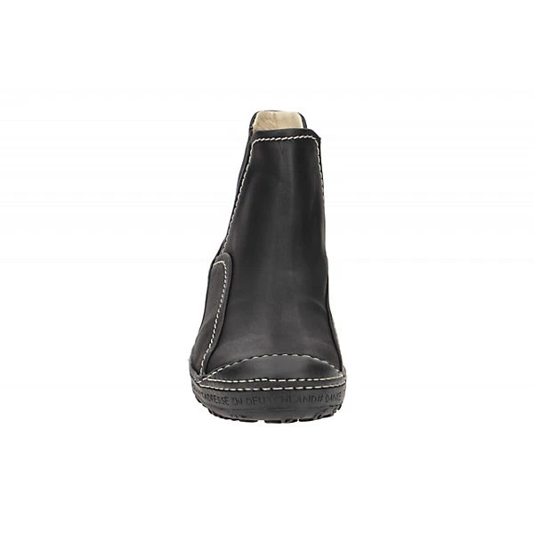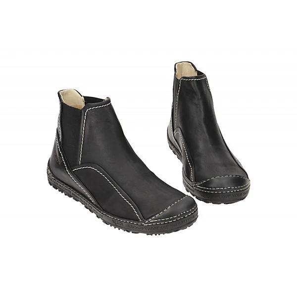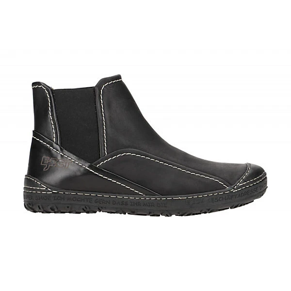 Hersteller: Eject Hersteller Art-Nr.: 20756 Modellname: DASS II Machart: Damen Stiefeletten – sportliche Stiefelette Farbe: schwarz matt + Nähte in weiß + Sohle in schwarz (black) Obermaterial: Echtleder – Glattleder Innenfutter: Echtleder – naturgegerbt Innensohle: Echtleder – naturgegerbt Wechselfußbett: Ja – herausnehmbare Innensohle Laufsohle: robuste Profil Gummisohle Verschluss: Gummizug – ohne Verstellmöglichkeit Absatzart: flach – kein Absatz Schuhform: rund Größenhinweis: fällt normal aus Weitenangabe: G – normal Weite