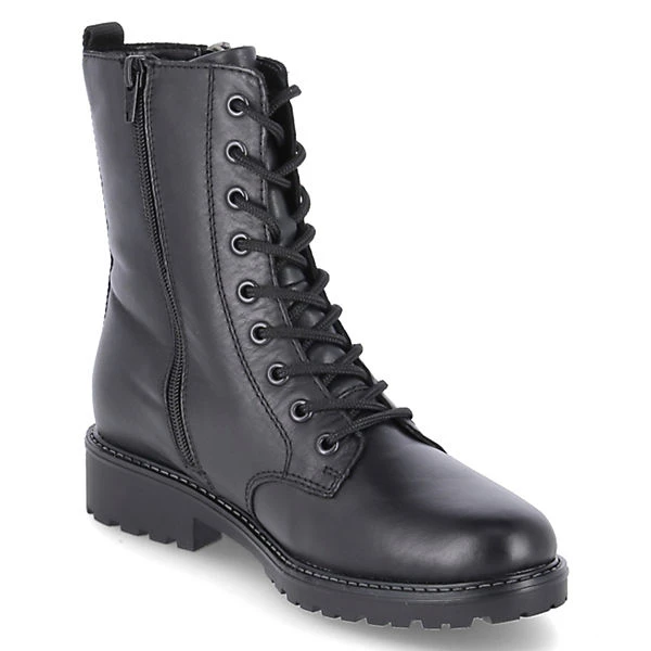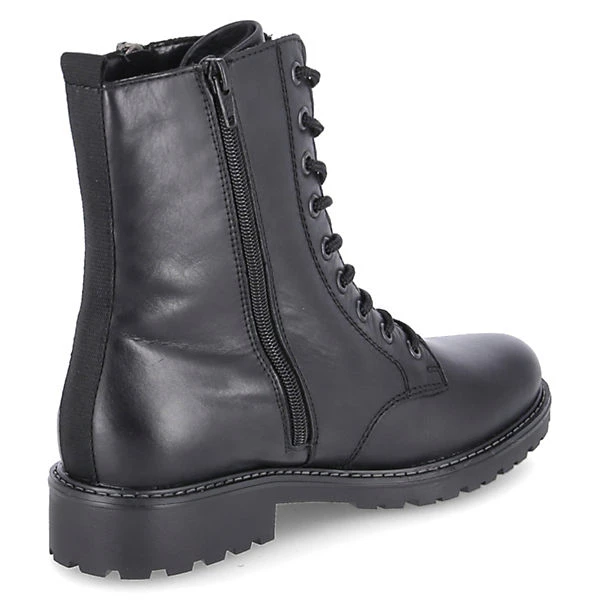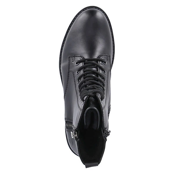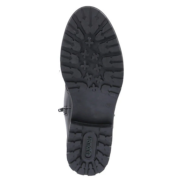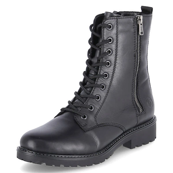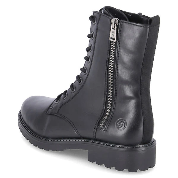 Remonte Damen Stiefeletten/ Schnürboots/ Winterstiefeletten Schwarz Glattleder – Schnürung und zwei Reißverschlüsse – Zierschnalle am Einstieg – warmes Textilfutter – Ziernähte – robuste, leichte Profillaufsohle – Thermo-Decksohle