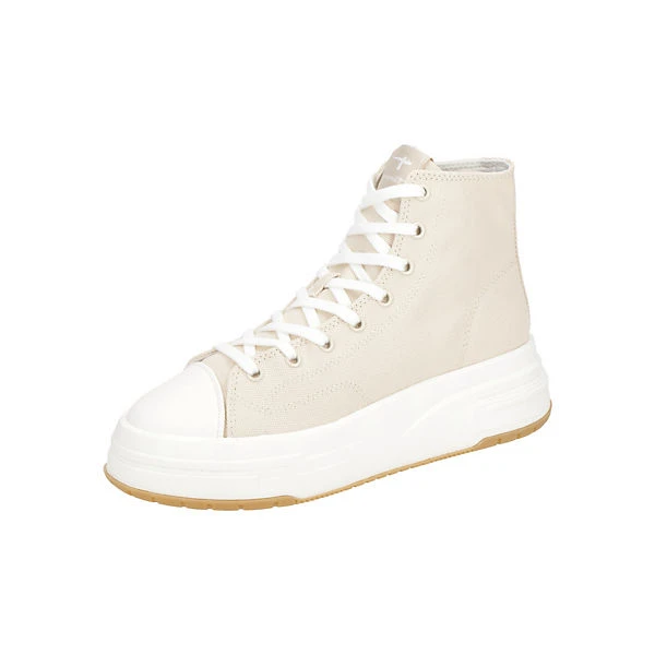 Hersteller: Tamaris Hersteller Art-Nr.: 1-25216-20 418 Modellname: 25216 Machart: Damen Stiefeletten – sportliche Stiefelette, Plateau Chucks Farbe: beige + weiß (ivory) Obermaterial: Synthetik + Textil (Vegan) Innenfutter: Textil, recyceltes Futter Innensohle: Textil Fußbett Wechselfußbett: Ja – herausnehmbare Innensohle Laufsohle: Gummisohle, Plateau ca. 4,5cm Verschluss: 8fach Schnürung Absatzart: flach – kein Absatz Schafthöhe: Knöchelhoch, ca. 12cm Schuhform: rund Größenhinweis: fällt normal aus Weitenangabe: G – normal Weite