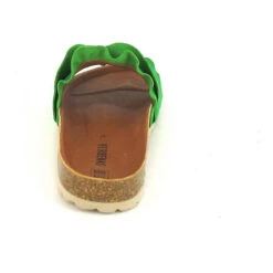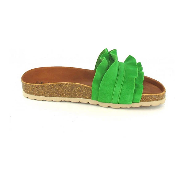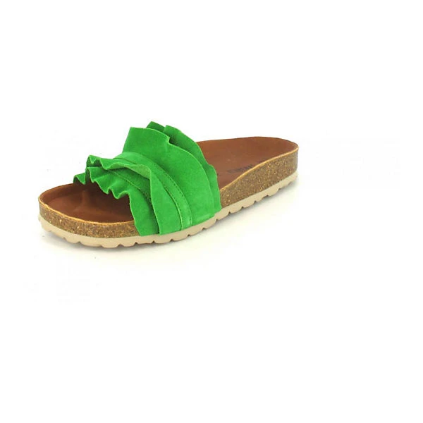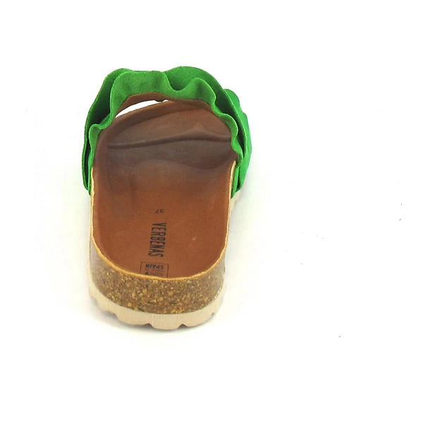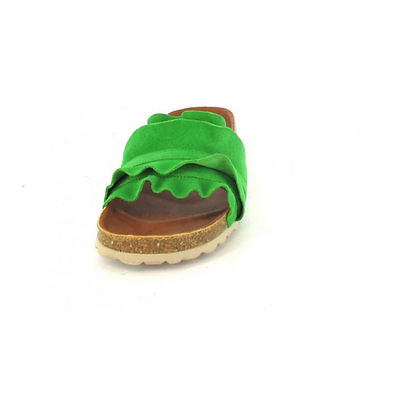 – Moderne Damen-Pantolette von Verbenas in der Trendfarbe Grün – Obermaterial aus weichem Velour-Leder – die schöne Raffung ist ein modischer Blickfang – lederüberzogenes Kork-Fußbett – rutschhemmende Laufsohle
